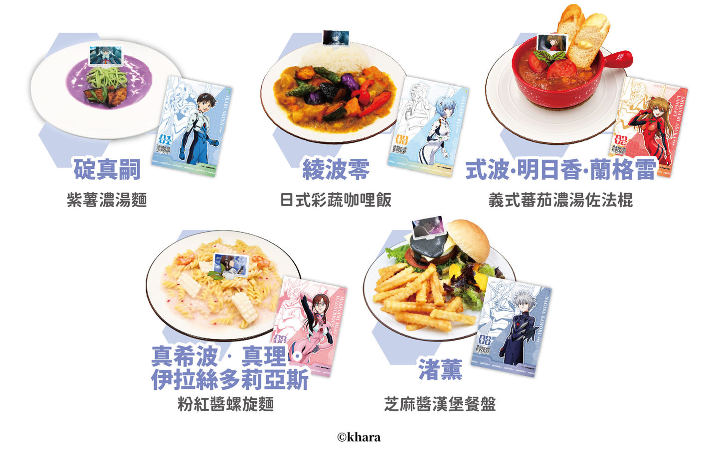 本次主題餐點餐點以創意蔬食發揮,包含紫薯濃湯麵、日式彩蔬咖哩飯、義式蕃茄濃湯佐法棍、粉紅醬螺旋麵、芝麻醬漢堡餐盤等等,均為一般主題餐廳中較少見的特製料理,搭配聖代、甜點、飲料等餐食,感受作品氛圍同時滿足口腹之慾。點餐除了附贈餐點插卡以及專屬吸管套,各項用餐特典包含光澤感記念卡、機體雷射小卡、特製杯墊等,值得粉絲收集珍藏。