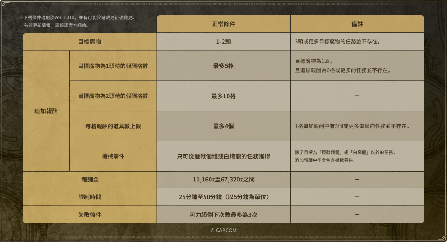據官方說明,本作中已有玩家對進階難度的「調查任務」「實地調查任務」等遊戲數據進行不正當修改,此次公開了現行版本 Ver. 1.010 中任務的正常條件,以便辨識改造任務,並明列了額外獎勵欄位數量、報酬金額、限制時間及失敗條件等細節。