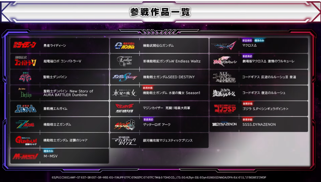 參戰 《超電磁機器人 孔巴德拉 V》 《聖戰士丹拜因》 《新編聖戰士丹拜因》(New Story of Aura Battler DUNBINE) 《銀河機攻隊 莊嚴皇子》 《Code Geass 復活的魯路修》 《勇者萊丁》 《重戰機艾爾蓋》 《機動戰士 Z 鋼彈》 《機動戰士鋼彈:逆襲的夏亞》 《新機動戰記鋼彈 W:無盡的華爾茲》 《機動武鬥傳 G 鋼彈》 《機動戰士鋼彈 SEED DESTINY》 《無敵鐵金剛》 《無敵鐵金剛 死鬥!暗黑大將軍》 | 家用平台首次參戰 《劇場版超時空要塞&激情的女武神》 《蓋特機器人 Arc》 新規參戰 《機動戰士鋼彈:水星的魔女 第一季》 《SSSS.DYNAZENON》 《哥吉拉 S.P〈奇異點〉》 |