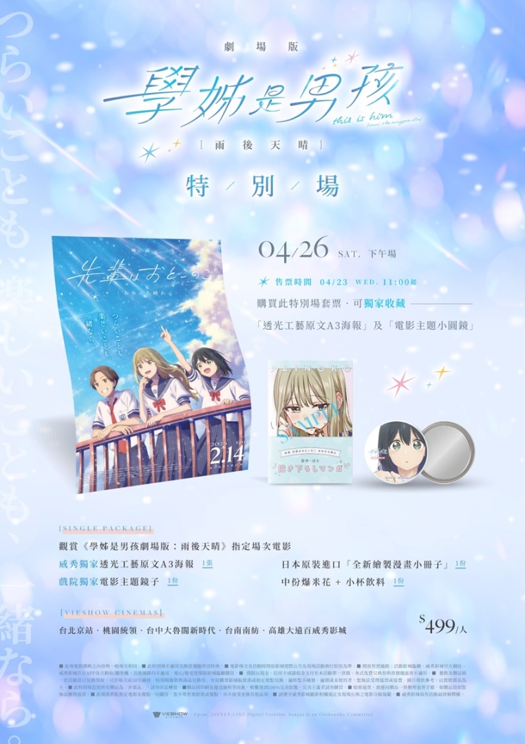 《學姊是男孩 劇場版:雨後天晴》上映首週推出限量特典活動,觀眾凡購票觀影,即有機會獲得日本原裝進口、全新繪製的【特製漫畫小冊子】,數量有限,贈完為止。