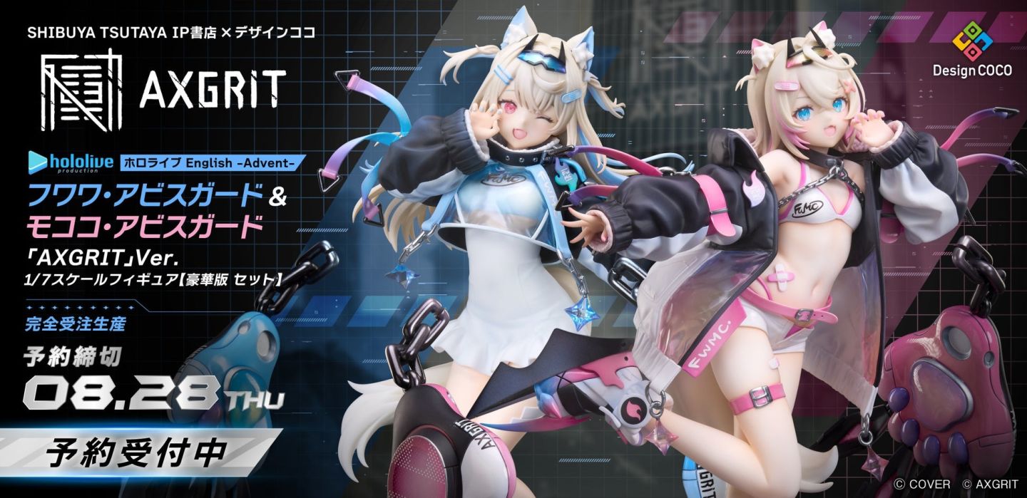 「AXGRIT」是一個以滿目瘡痍的未來世界中,裝備反重力裝置的角色「飛行」與「戰鬥」為主題的獨特世界觀,以 SHIBUYA TSUTAYA IP 書店為中心出發,開發各式各樣的商品和模型;作為品牌首發,來自 hololive English -Advent- 的 Fuwawa Abyssgard 與 Mococo Abyssgard 將以 1/7 的比例模型登場,在株式會社 Cover 的權利合作下,讓兩個模型以反映 AXGRIT 世界觀的原創服裝登場。