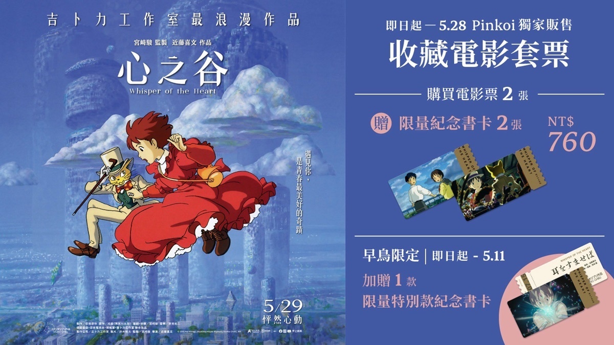 為紀念《心之谷》重返大銀幕,Pinkoi 與甲上娛樂合作發行全球唯一復古紀念票卡,於今(2)日限量開賣,精選《心之谷》中包含「初遇男爵、屋頂的約定」等動人場景,於 5 月 11 日前下單再加贈早鳥限定「雯的蛻變之石」限量紀念票卡,讓你時刻重溫最初的悸動,紀念那份純粹而美好的感動,電影套票內含 2 張電影票加贈限量票卡 2 張、早鳥票卡 1 張,數量僅限一千套,送完為止。