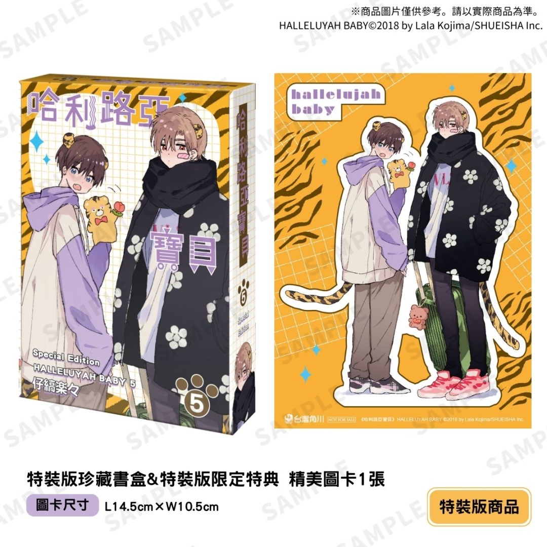 但願明日也能與你一同度過這樣的日常——《哈利路亞寶貝 (5) 特裝版》內容收錄:冬夏與都穿著浴衣,帶來清新夏日氛圍的「壓克力透卡1張」、光澤感十足且精緻的「珠光圖卡 5 張」,還有以可愛俏皮的老虎打扮為主題的「組合壓克力立牌」,以及「本集漫畫(隨書附首刷限定書卡)」與「特裝版精美圖卡」,所有特典將完美收納於設計獨特的「特裝版珍藏書盒」中。