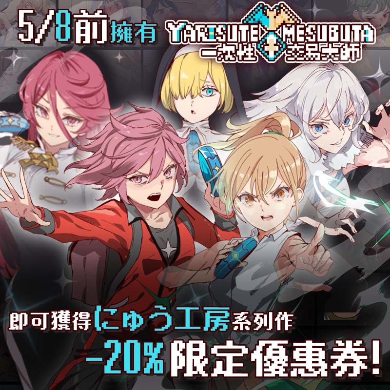 《YARISUTEMESUBUTA~一次性交易大師~DLC2 母豬米亞文明的遺產》繁體中文無碼版於 5 月 8 日在 072 Project 發售,目前正在舉辦上市紀念活動!只要是在 5 月 8 日前在 072 Project 擁有《YARISUTEMESUBUTA~一次性交易大師~》遊戲本傳,即可於 DLC2 上市後獲得不限使用次數的「にゅう工房」系列遊戲 20% 折扣優惠券,而遊戲本傳則是到 5 月 22 日為止都有八折優惠!