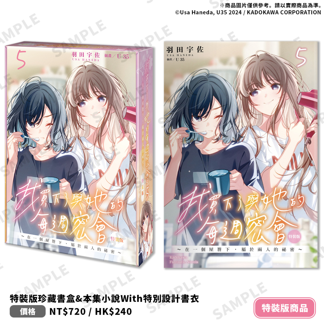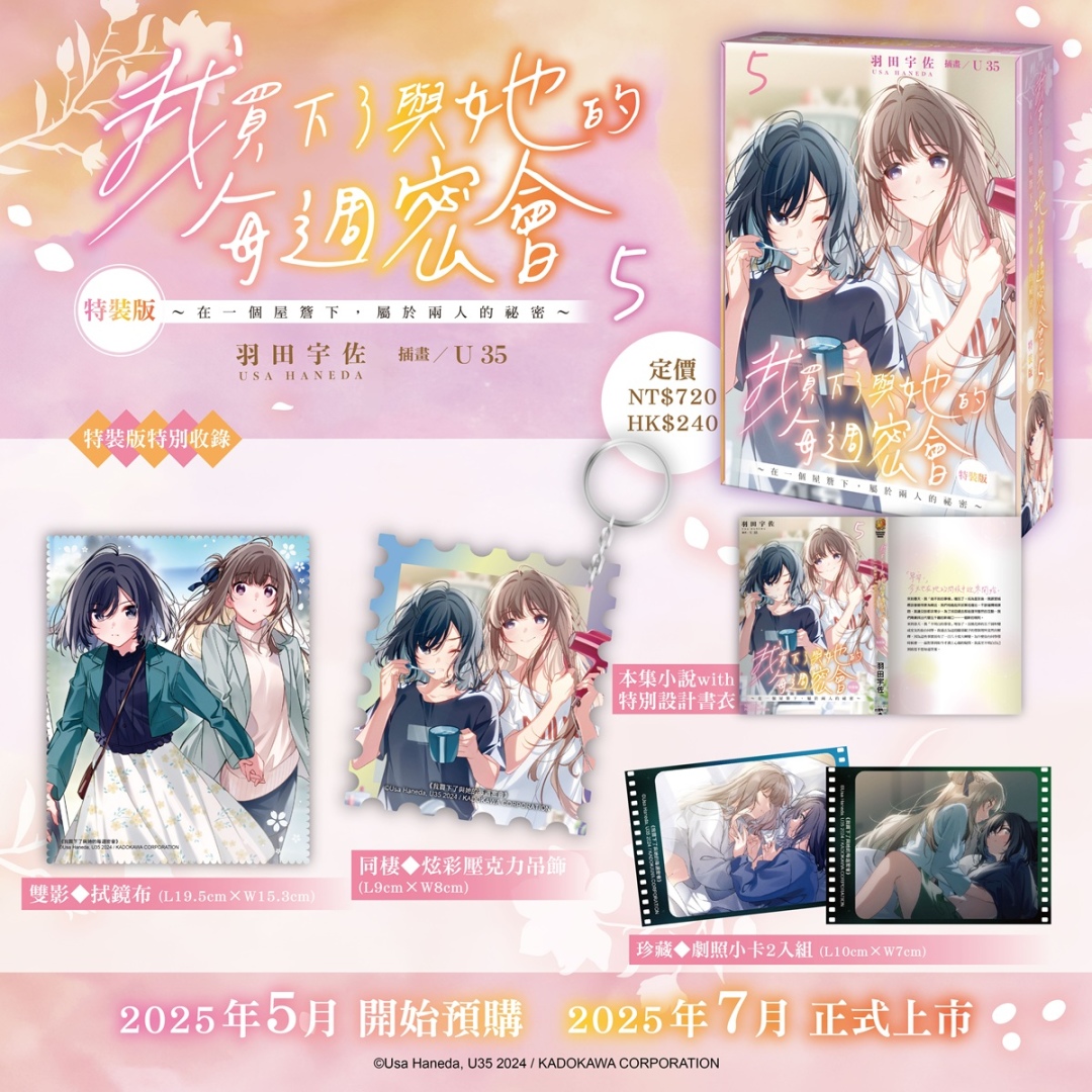 第 5 集延續前作進展,進一步描寫兩人同居後的日常變化與心理拉扯,作品將在 2025 年漫畫博覽會首賣(預定 2025 年 7 月 24 日上市),同步推出特裝版並收錄多項收藏周邊(特裝版定價 720 元)。自即日起可至角川官方網站及指定書店通路進行事前限期預購(時間至 2025/5/23(五)23:59 止)。若於角川官網完成預購,再加碼送 NT$100 官網購物金!