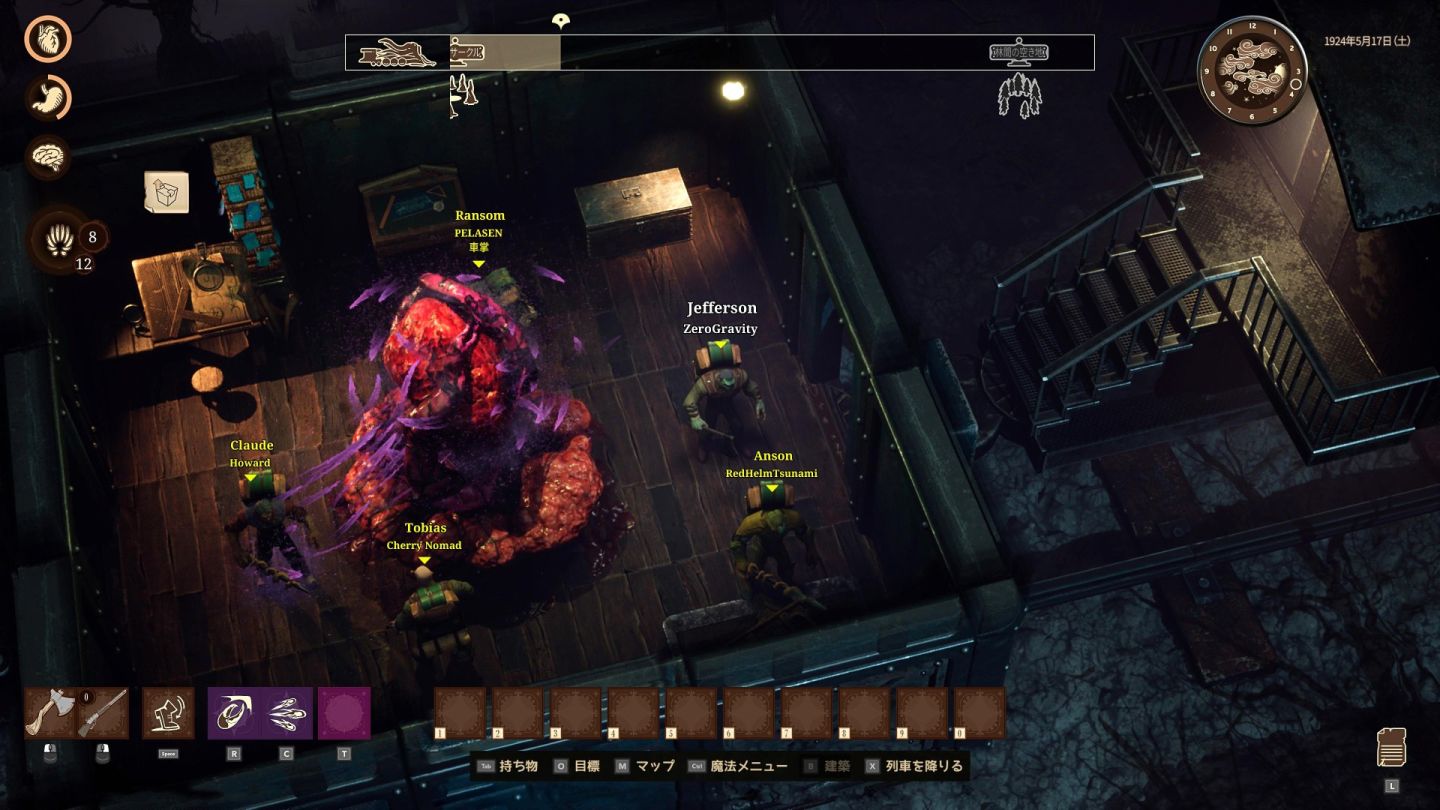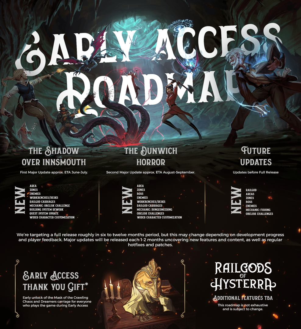 「RailGod」誕生於禁忌儀式及不潔魔法,不僅僅是部機械,而是散發著邪惡生命力、具有感知的火車頭。這個生物渴望敵人的血肉,當作延續旅程的強勁動能。這輛多輪巨獸堡壘不僅是玩家最重要的據點,也是對抗歇斯底里魔境時,最凶險的武器。玩家可利用邪惡的發明來升級車向,連結得越深,就能解鎖能與泰坦抗衡的力量,並見證舊日支配者的覆滅。