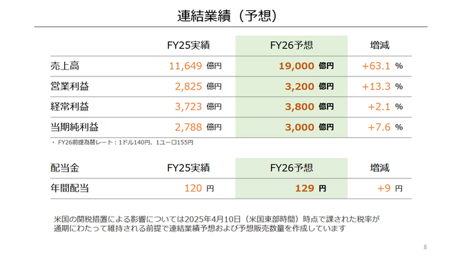 根據財報內容,任天堂預估由於新一代主機「Nintendo Switch 2」的推出,2026 年度的業績將在銷售額、營業利益、經常利益以及當期純利益等各方面全面提升;預計營業利益將達 3,200 億日圓(年增 13.3%)、經常利益為 3,800 億日圓(年增 2.1%),而銷售總額將達驚人的 1 兆 9,000 億日圓,與前一年度相比成長幅度達 63.1%。值得一提的是,這項預測是基於截至 2025 年 4 月 10 日美國維持現行關稅政策的情況下所作出的。