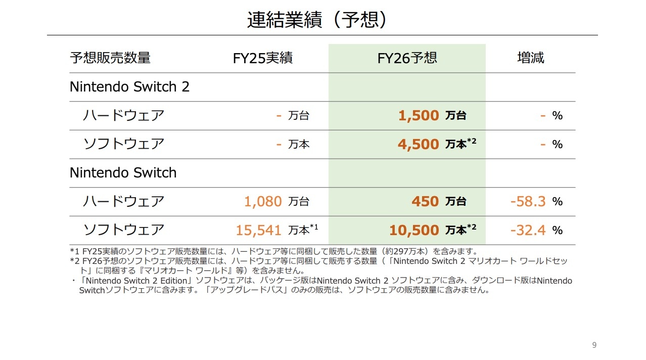 日本任天堂於今(8)日公開了 2025 年 3 月期的財報說明資料,並在其中公布了對 2026 年度的業績預測,包括銷售額將達 1 兆 9,000 億日圓,以及 Nintendo Switch 2 預計將有 1,500 萬台的銷售目標。
