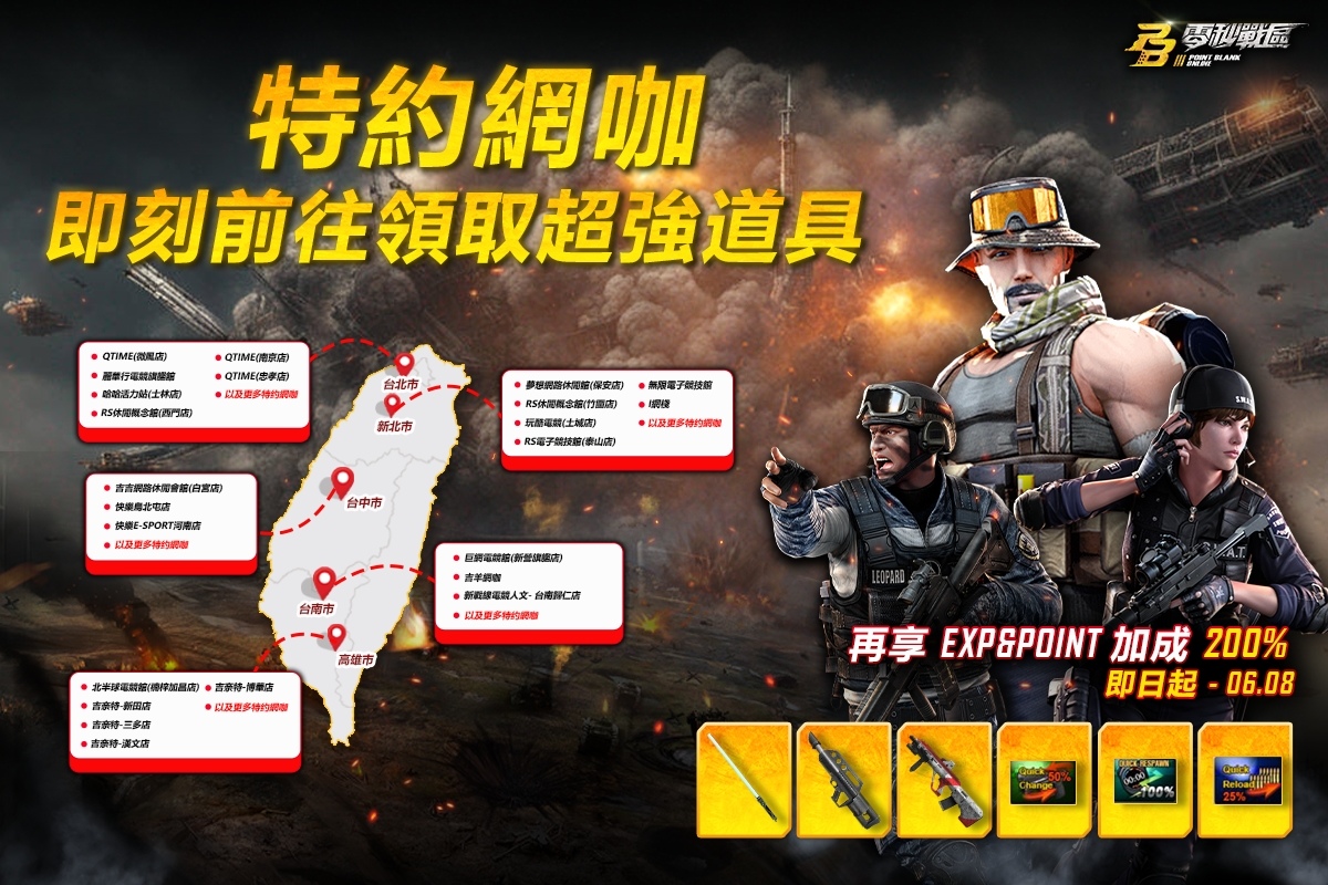 《Point Blank 零秒戰區》特約網咖活動火熱開跑,多重福利與精彩活動等您來體驗!趕快呼朋引伴,一同前往全台北中南超過 130 家特約網咖,享受刺激的槍戰樂趣,並將豐富好禮帶回家吧!