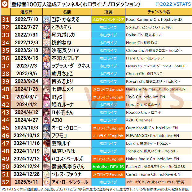 隸屬於虛擬偶像事務所 hololive production 一期生的 VTuber 亞綺.羅森塔爾(アキ・ローゼンタール,愛稱アキロゼ)於今(11)日 Youtube 頻道訂閱數突破一百萬,至此 hololive JP 本家成員都已取得金盾。