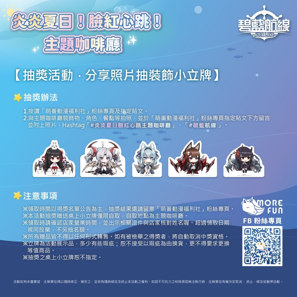 活動期間,凡來店用餐並與角色立牌、主題餐點或裝飾拍照,於「萌番動漫福利社」粉絲專頁指定貼文留言並附上照片,並加上指定 #Hashtag:「#炎炎夏日臉紅心跳主題咖啡廳 #碧藍航線」,即可參加線上抽獎活動,有機會獲得Q版桌上立牌。