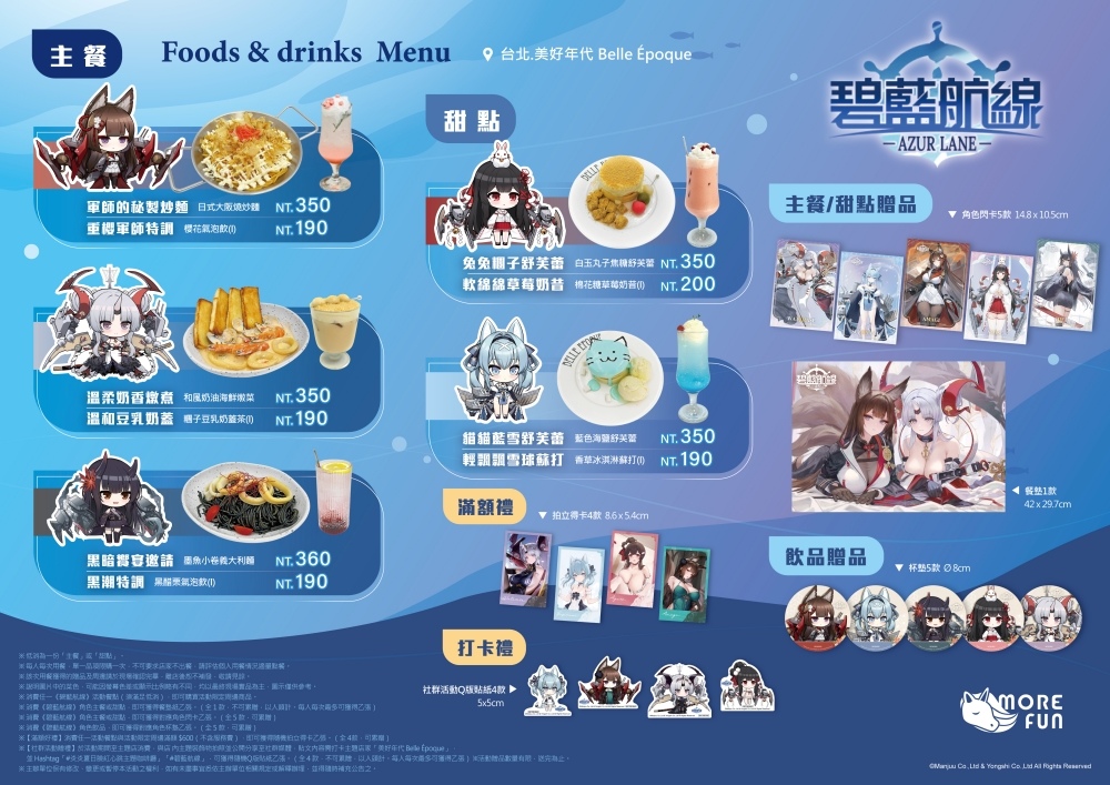 即時模擬海戰手機遊戲《碧藍航線》於 2025 年 5 月 15 日至 7 月 10 日在台北「美好年代Belle Époque」展開「萌番 More Fun」聯名主題咖啡廳活動,以「炎炎夏日臉紅心跳主題咖啡廳」為主題,打造沉浸式主題場景、限定角色餐點及豐富收藏特典,將採預約制營運。