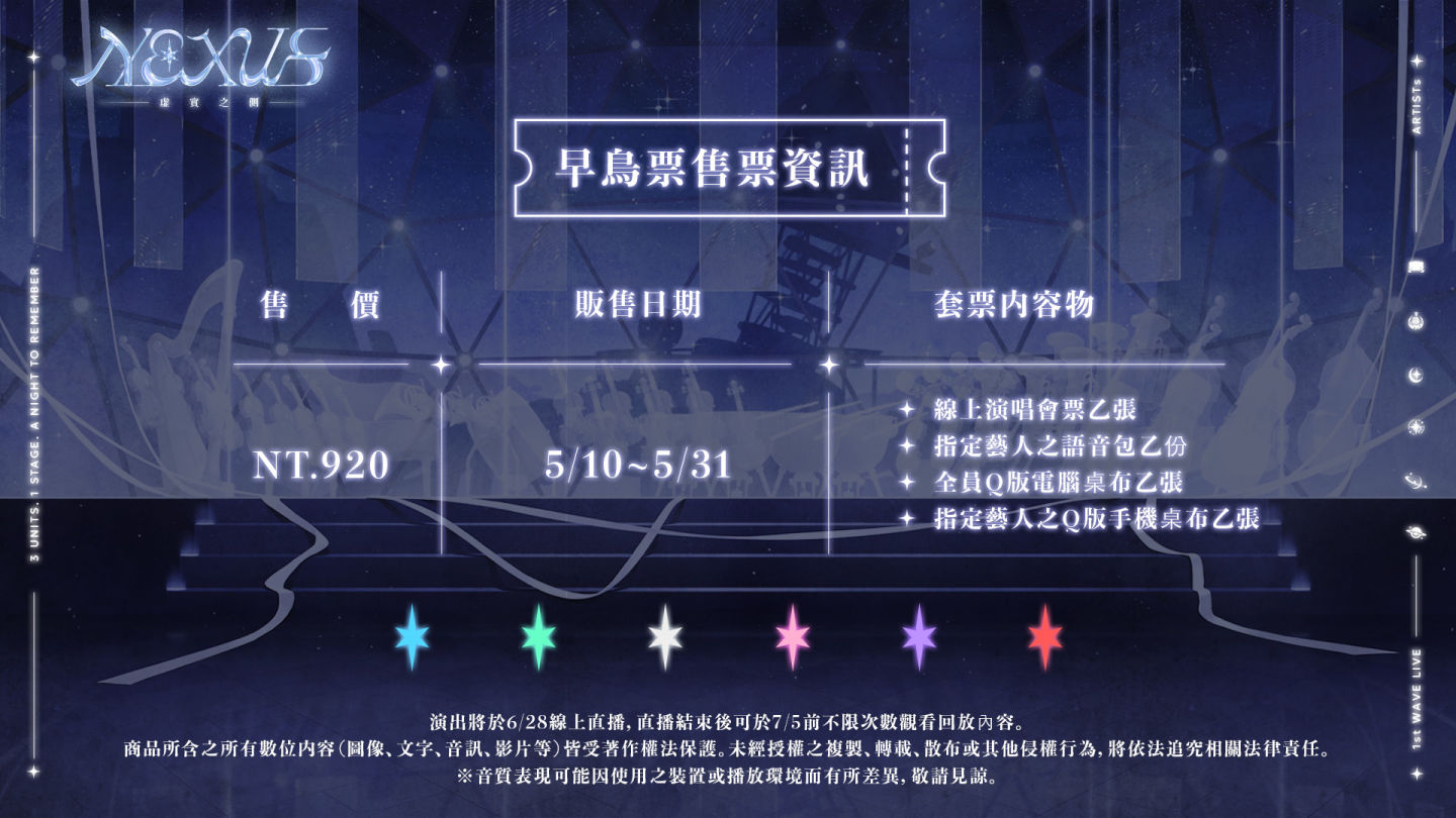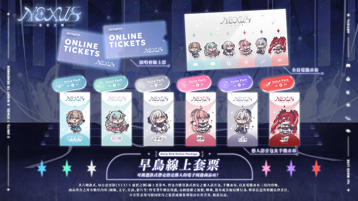 購買線上票的粉絲還可根據購買的套票款式(共六款),取得「NEXUS 虛實之側」線上票券以及包含購買款式指定之藝人語音包、手機桌布、電腦桌布三項內容物。線上票自購票日起可不限次數反覆觀看至 7 月 5 日(六),輕鬆重溫每一個感動瞬間,不錯過任何精彩畫面。