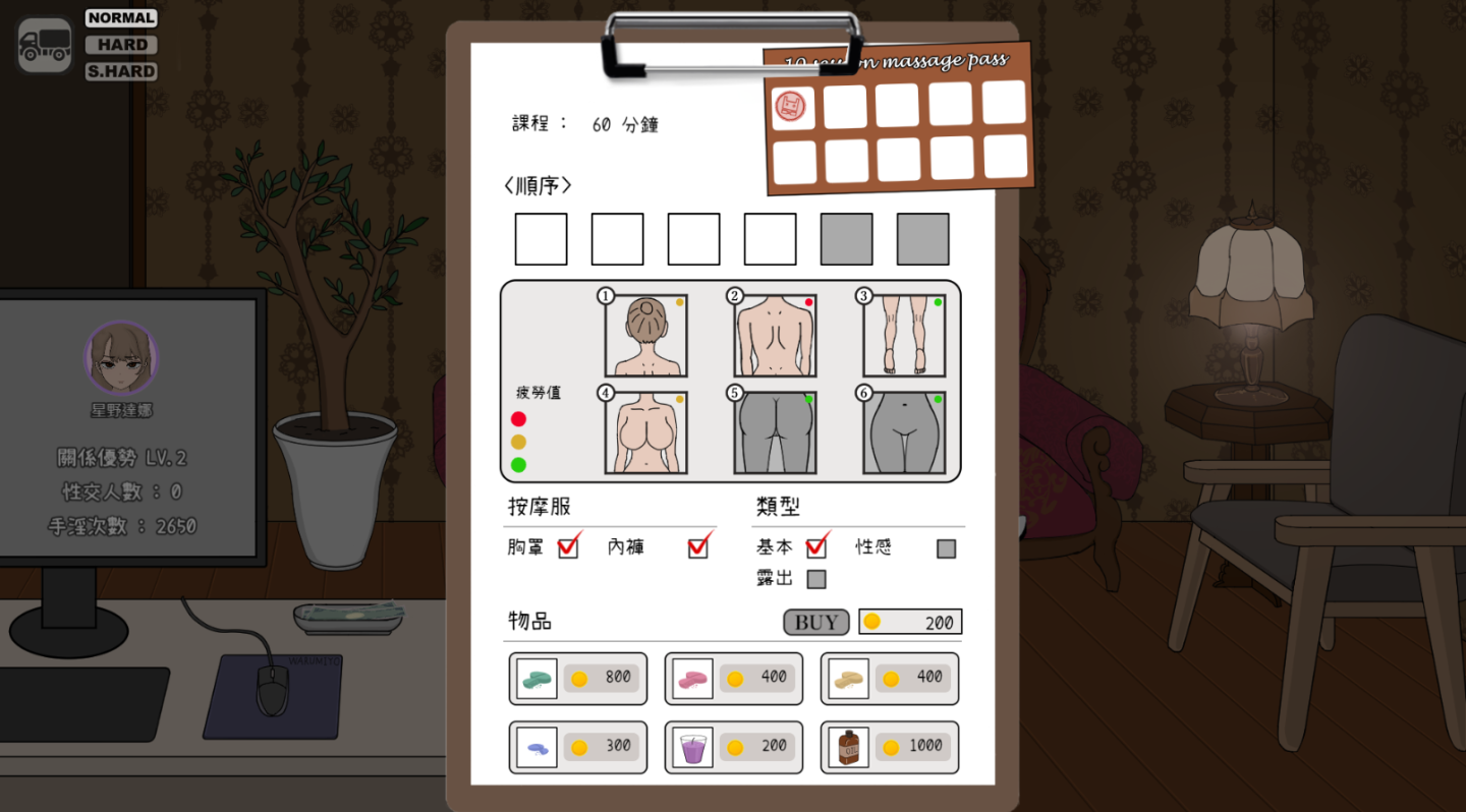 .不同的按摩手法和技巧會影響女主角的情緒指標。