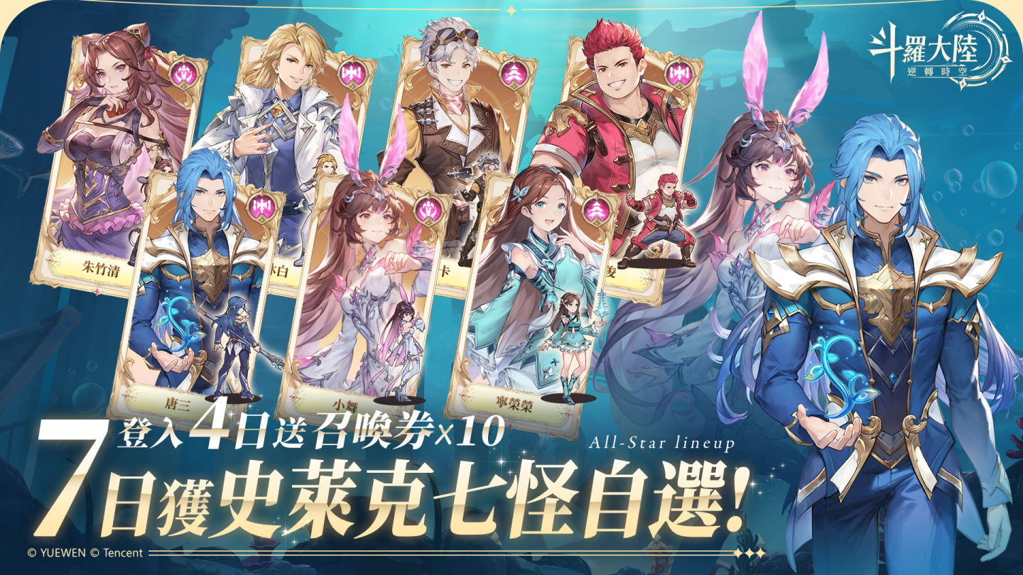 在享受福利與雙型態魅力之餘,迎新活動也不會錯過。首先登場的是七天登入活動「迎新豪禮」,除了能獲得 20 抽、千年魂環等獎勵,還能在第七日獲得史萊克七怪自選!躺著就加速七怪全收集!