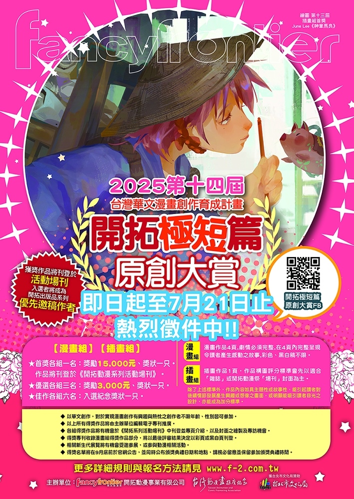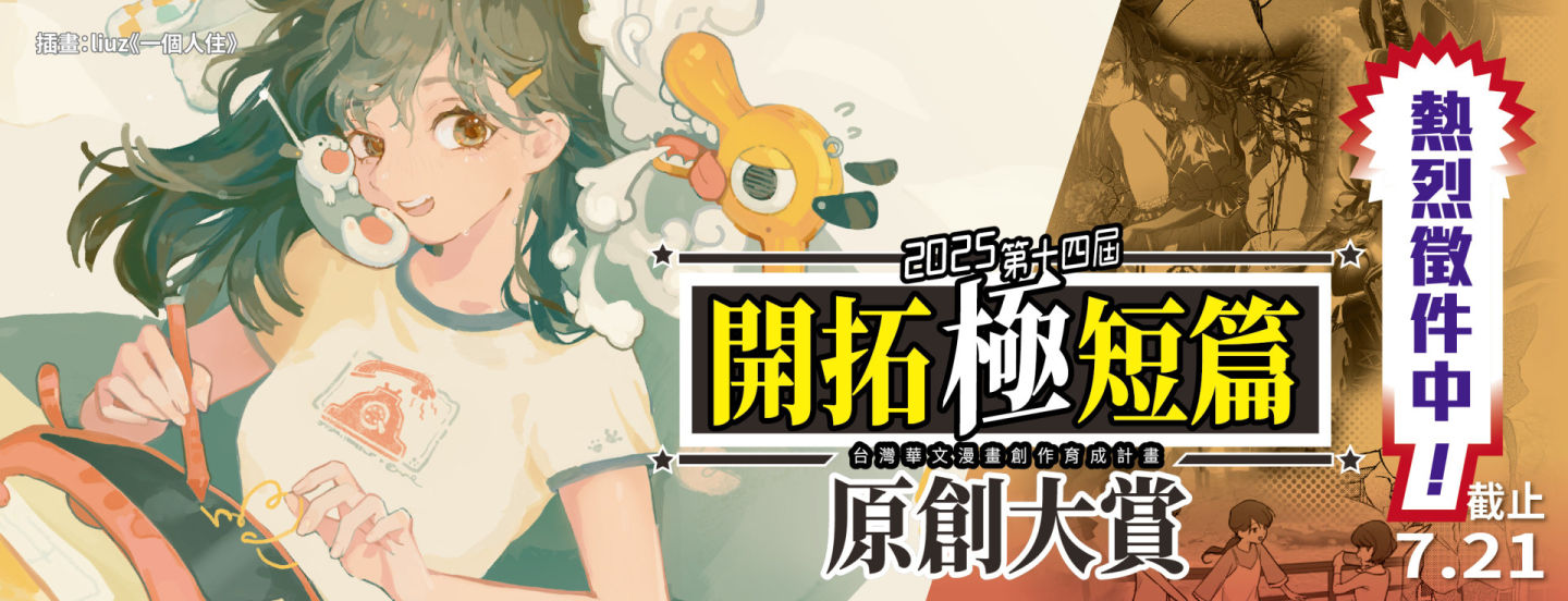 2025 年「第十四屆開拓極短篇原創大賞」熱烈徵件中!本屆大賞徵選「漫畫」與「插畫」兩組,入選者除可獲得獎勵金或禮品外,還將發表在有數萬人次閱覽的「開拓動漫祭系列活動場刊」,所有的入選作品並將集結成電子專刊推廣,入選者也有機會成為開拓系列場刊、宣傳廣告的優先邀請作者喔!