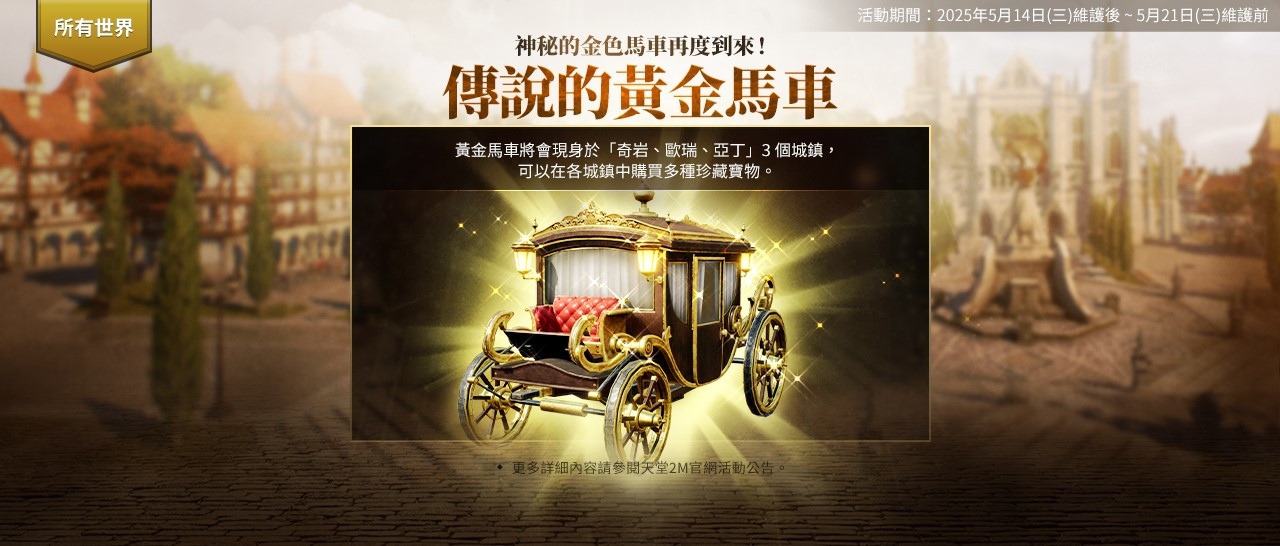 5/14 維護後~5/21 維護前,活動期間內,黃金馬車將會現身於「奇岩、歐瑞、亞丁」3 個城鎮,可使用金幣向傳說的黃金馬車 NPC 購買多種珍藏寶物。