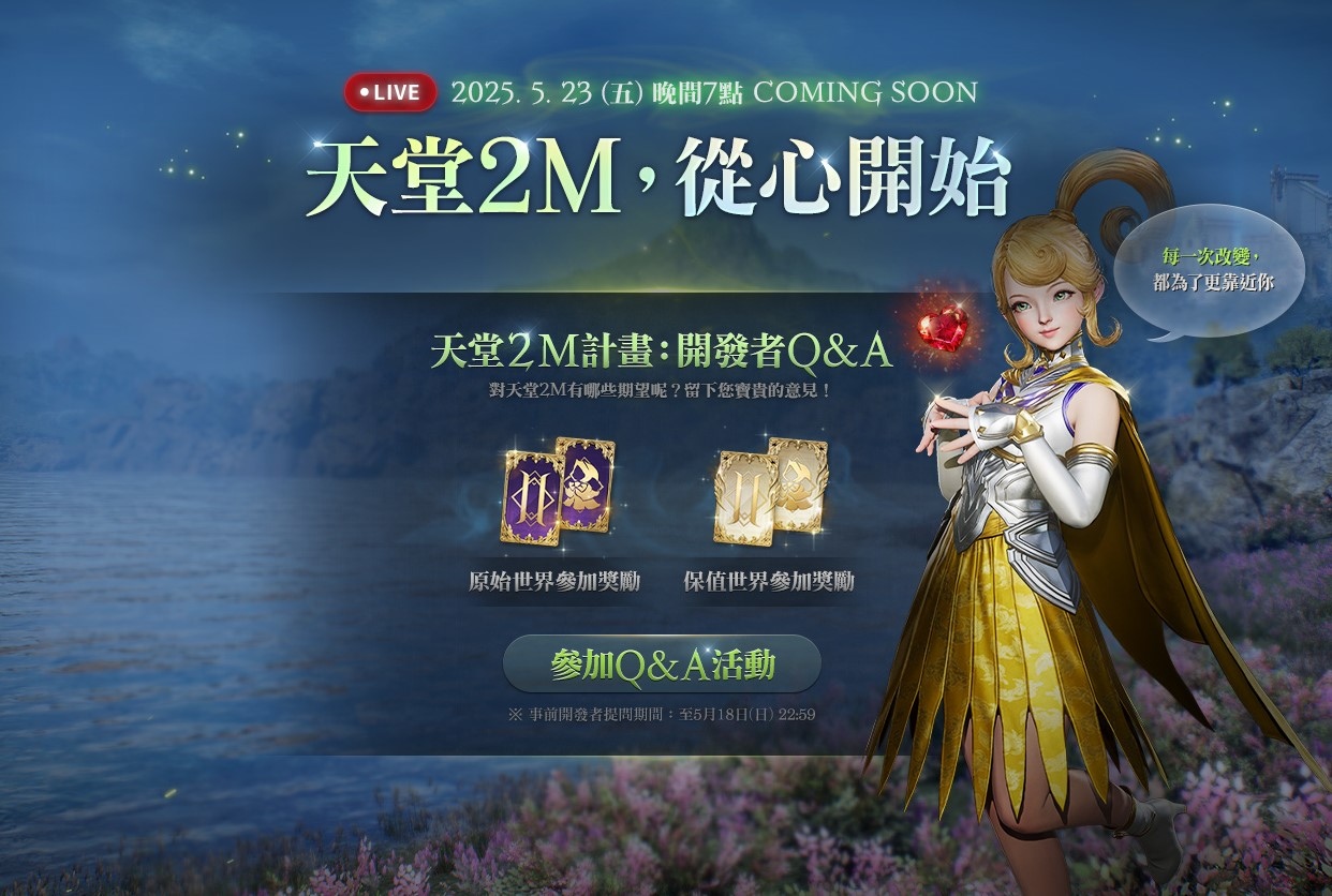 此外,為了更貼近玩家,開發團隊將收集玩家對於《天堂2M》寶貴的意見,並於直播中進行回覆;即日起至 5 月 18 日(日)22:59 止,繼承者們可前往官網參加「開發者 Q&A」活動,留下寶貴意見,還可獲得活動獎勵喔!