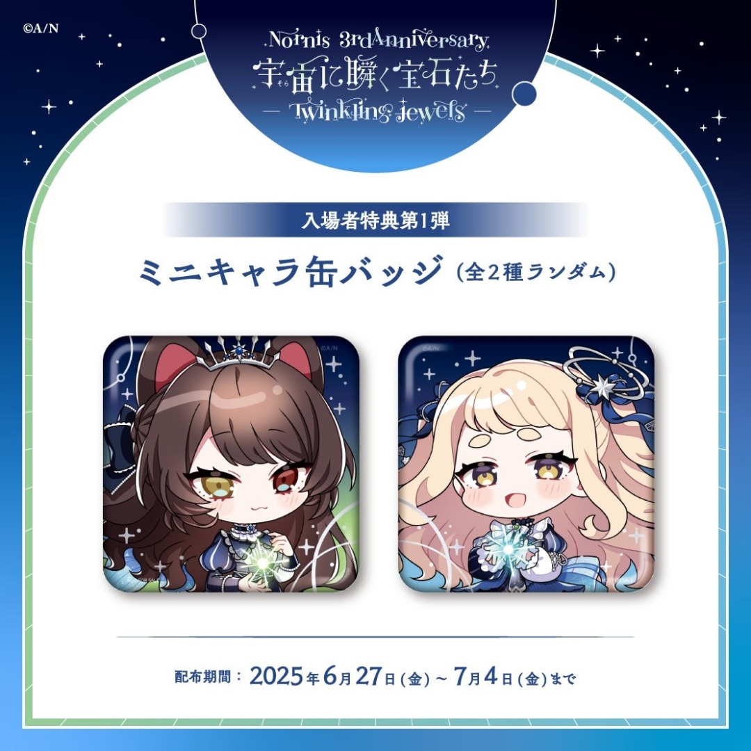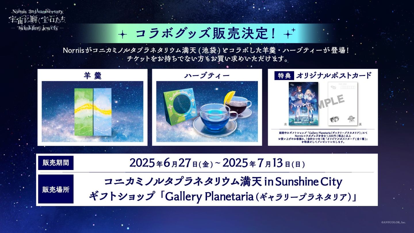 天文館活動門票的抽選預約自即日起開放至 5 月 25 日,來場者可根據觀賞時間錢後半段獲得不同的限量贈品(迷你角色徽章/迷你角色壓克力立牌),而在附設禮品店也會販賣以 Nornis 樂曲〈Circle of stars〉為主題設計的限定周邊(草本茶&羊羹),喜歡 Nornis 的粉絲們不要錯過!