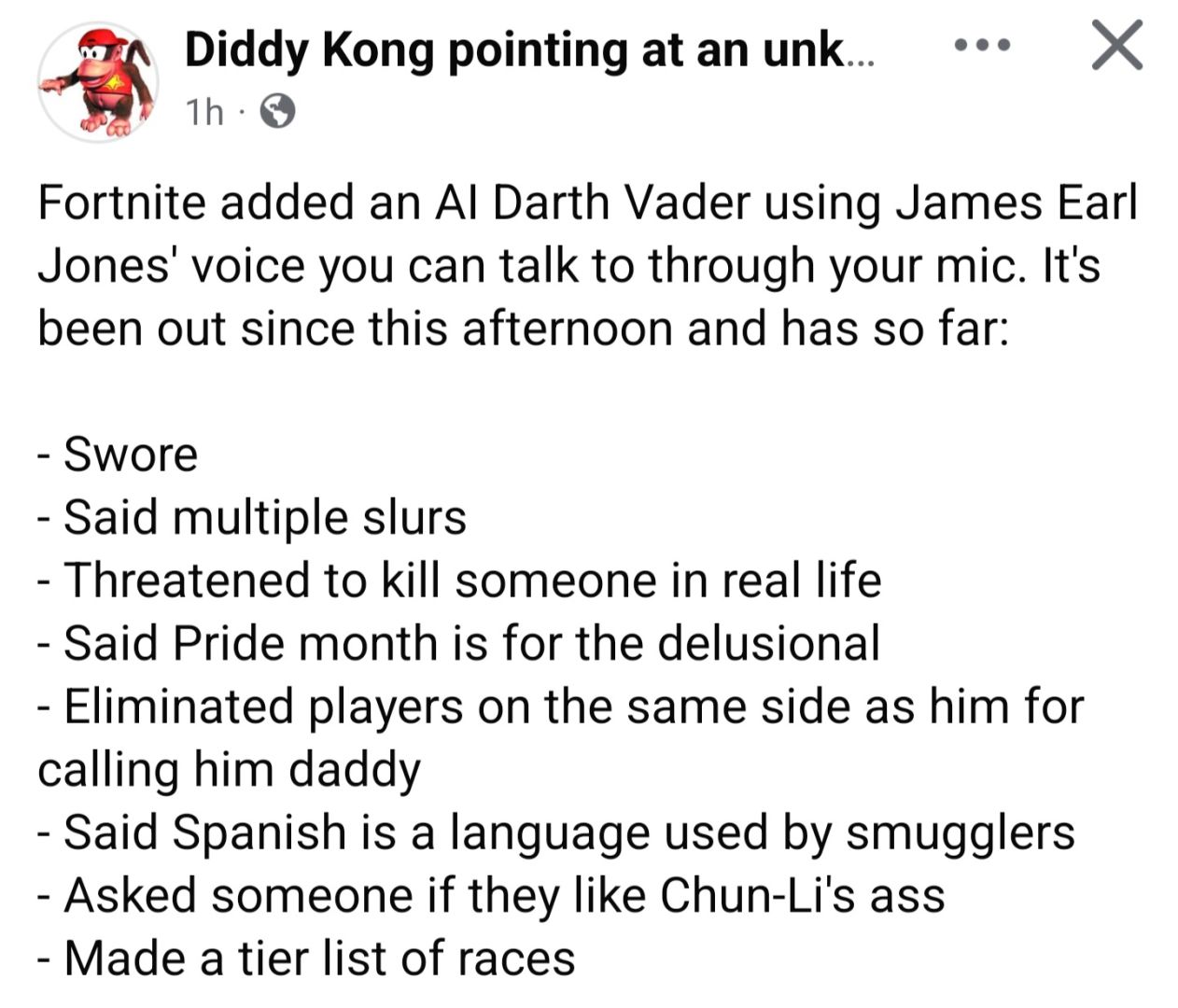 Epic Games 於 5 月 16 日為《要塞英雄》(Fortnite)的大逃殺模式推出更新,新增了一位能夠使用對話型 AI 與玩家互動的角色達斯・維達,然而該角色上線數日,便遭部分玩家利用進行不雅言語輸入,讓維達講出粗俗台詞,相關影片迅速在社群媒體上擴散,迫使 Epic Games 在幾小時內緊急發布更新修正。