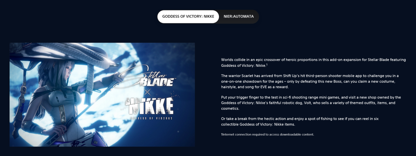 此外在 SIE 的《劍星》PS5 產品說明頁於美版官網語系上,率先更新了《勝利女神:妮姬》DLC 的內容如下: