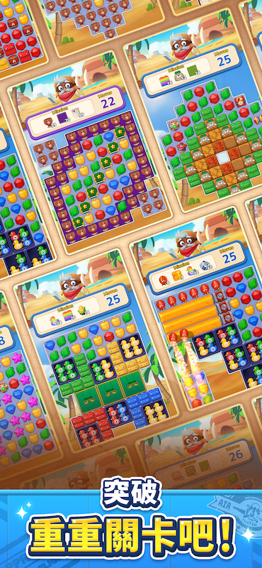 遊戲內將包含「Normal」、「Hard」、「Very Hard」各種難易度的關卡,無論是首次嘗試三消遊戲的初學者,或是精通遊戲的資深玩家,都能盡情享受遊玩樂趣。除了一般的三消類型關卡外,還有能夠獲得大量遊戲金幣,或是幫助法蘭克解決危機的特別關卡等,多樣化的關卡類型等你來體驗!關卡類型千變萬化,未來也會持續更新更多新關卡喔!