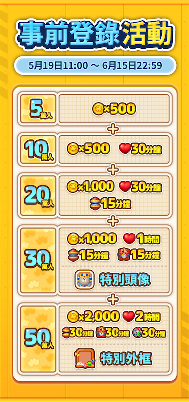 《LINE 天外消消樂》App Store/Google Play 事前登錄活動現正進行中!除了會依照事前登錄活動的參加人數,贈送可以幫助遊戲加速進行的「金幣」之外,只要事前登錄活動的參加人數越多,還會贈送包含達成事前登錄活動指定目標就能入手的「上線紀念特別頭像」與「上線紀念特別外框」等更多其他豪華獎勵!快和好友一起參加事前登錄活動吧!