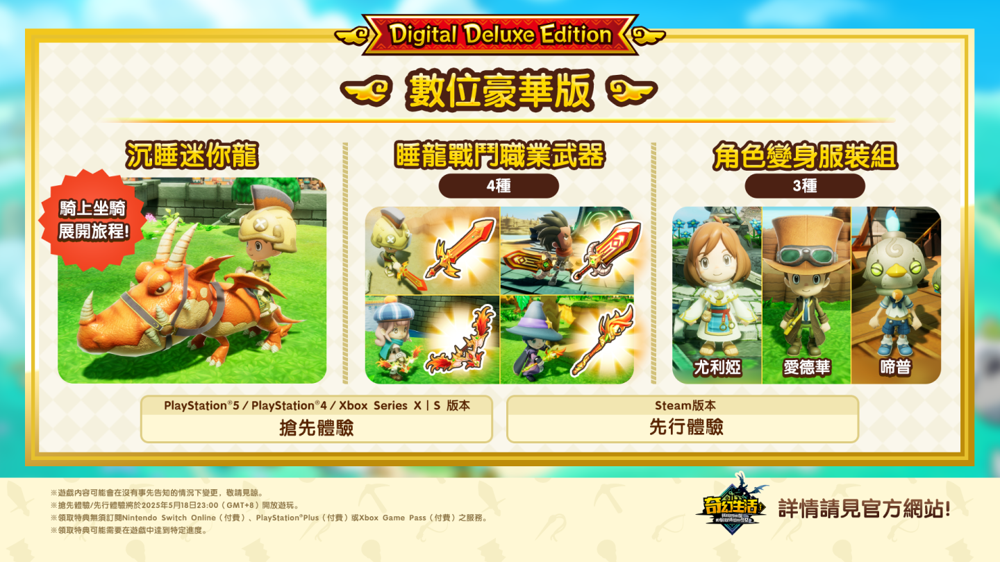 此外購買數位豪華版的玩家,可享有額外的特典,特別收錄了遊戲中登場角色的變身服裝組,以及「沉睡巨龍」的專屬裝備和坐騎等限定虛寶。