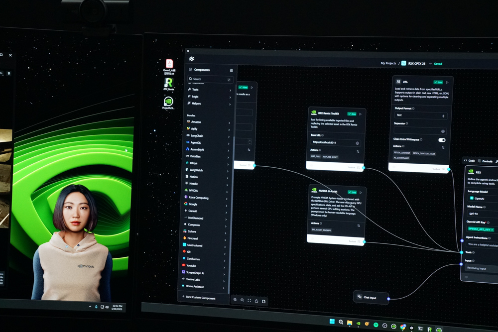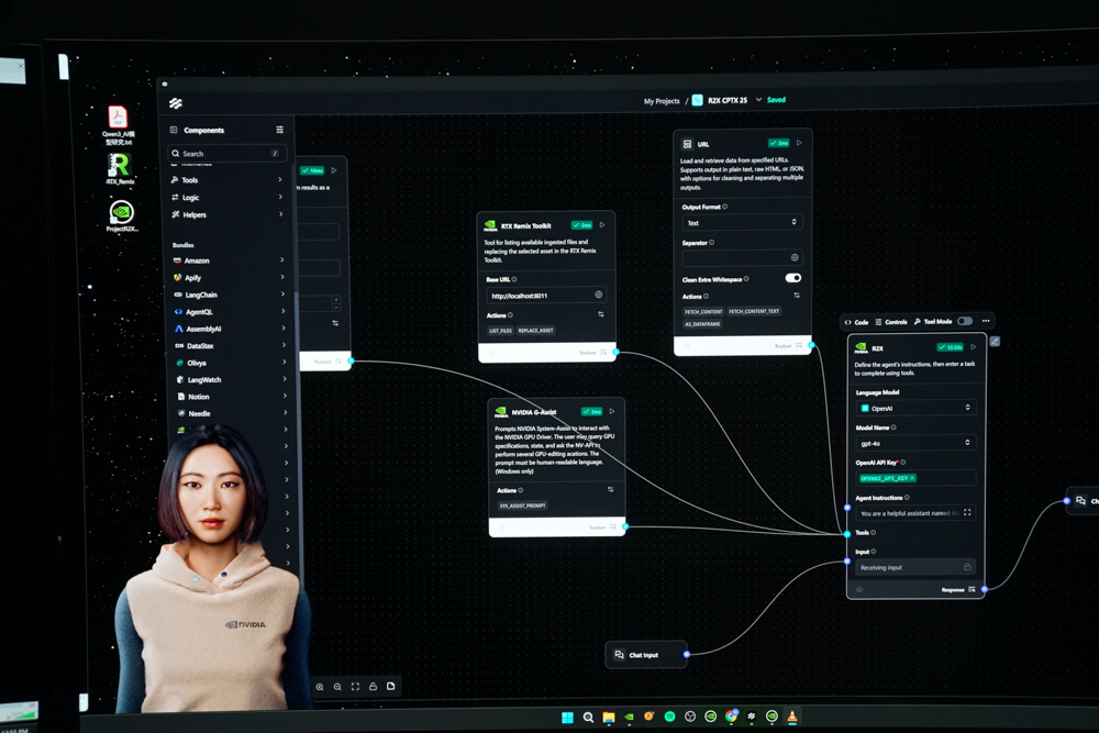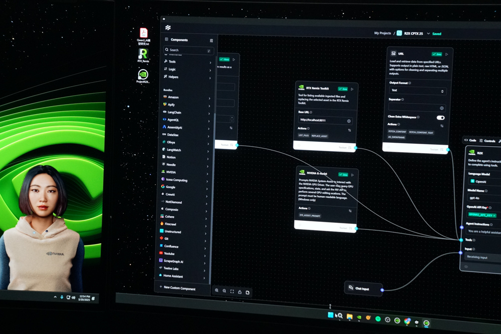 Aki 的語音和臉部動畫都是在本地生成的,使用於於 NVIDIA Audio to Face 3.0 技術。Audio to Face 3.0 是一個新的 Diffusion 架構,可透過 NVIDIA Ace 外掛程式使用,也能廣泛應用於遊戲角色。該系統可以連接到 Linkflow,作為視覺化的「無程式碼到低程式碼」編輯器,用於組合不同的 AI 模型、工具和功能。透過 Linkflow 桌面版提供了一個 NVIDIA G Assist 節點,允許 AI 助理呼叫 G Assist 的功能。例如,用戶可以透過語音指令讓 Aki 使用 G Assist 更改鍵盤燈光顏色。