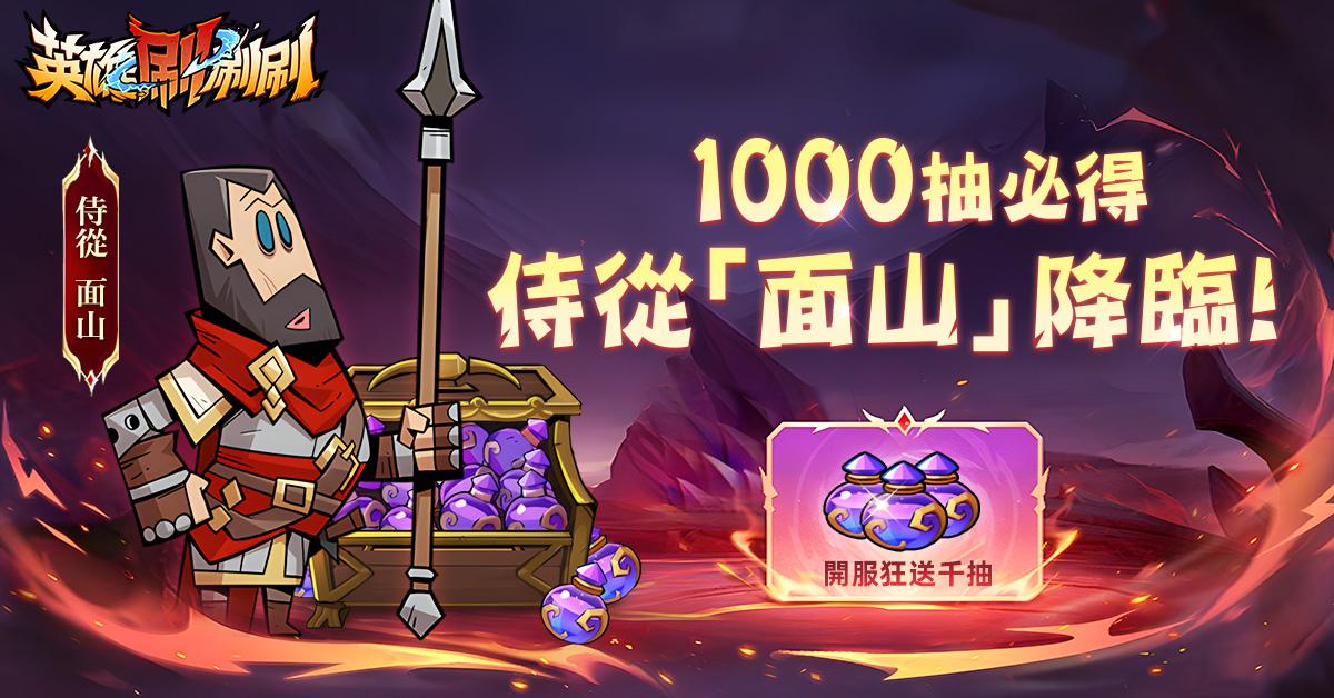《英雄刷刷刷》上線即推出限時福利「新手魔爐」千抽活動,玩家透過完成日常任務即可獲得「魔爐藥劑」抽獎券,累計抽取達 1,000 次必得神話級侍從「面山」,這位攻守兼備的頂級夥伴能同時提供增傷與減傷光環,助你輕鬆征服暗黑大陸!活動期間完成指定任務即可暢享千次抽取機會,現在加入立即體驗「新手魔爐」帶來的極致戰鬥加成!