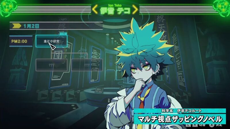 .科學省「伊音梃(伊音テコ)」路線:本路線為多重視點的視覺小說 ADV 玩法。在本路線中,會有隨著不同人物登場視角也會隨之切換,甚至時間也會隨之分歧的分歧劇情,玩家需要透過不同視角收集線索來找出真相。