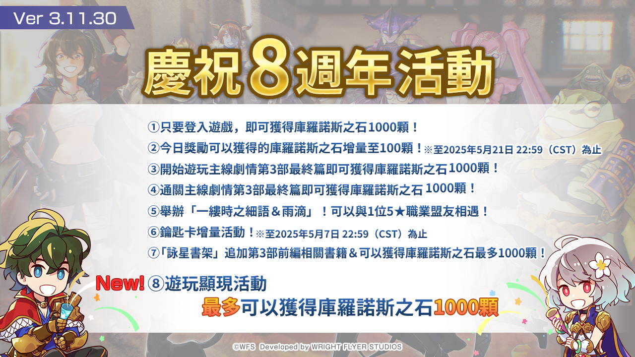 最多可以獲得 3,000 顆庫羅諾斯之石的慶祝 8 週年活動也持續舉辦中