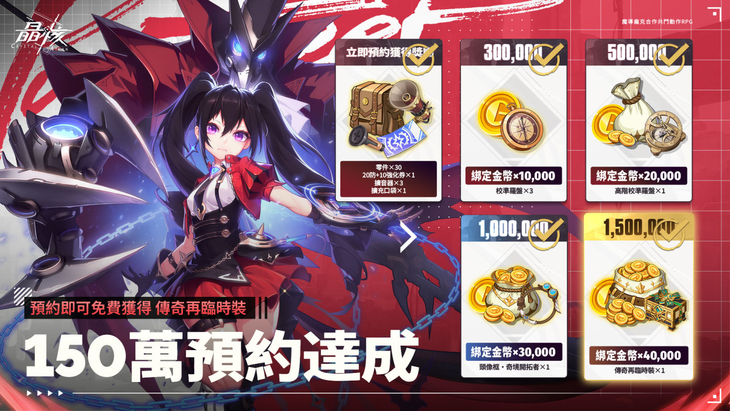凡在事前登錄頁完成所有里程碑任務的冒險者,於遊戲正式上線後可領取 10 萬綁定金幣、強化券與校準羅盤等實用養成資源,更可獲得專屬預約頭像框「奇境開拓者」與限定時裝「傳奇再臨」!