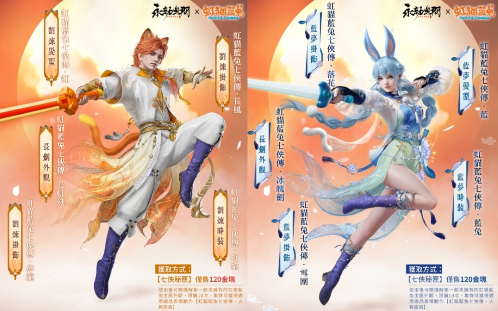 而劉煉、藍夢也將換上全新造型,化身經典主角虹貓與藍兔,展現與過往截然不同的武俠氣息,共赴一段蕩氣迴腸的武俠情緣!玩家將可透過開啟商城道具「七俠祕匣」隨機獲得包含虹貓藍兔聯動主題時裝、武器、髮型、掛飾等獎勵,打造屬於自己的獨門武俠風格!