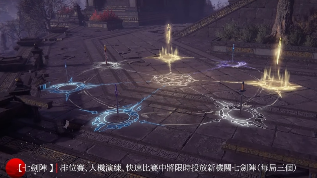 聯動活動開啟後,《永劫無間》於排位賽、人機演練、快速比賽等對局中,將限時新增特別聯動機關「七劍陣」。玩家只需於劍陣中投入對應品質與數量的武器、裝備或道具,即可啟動機關,喚醒七把神劍之力。