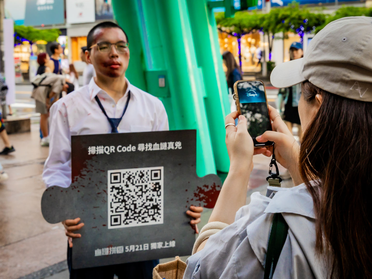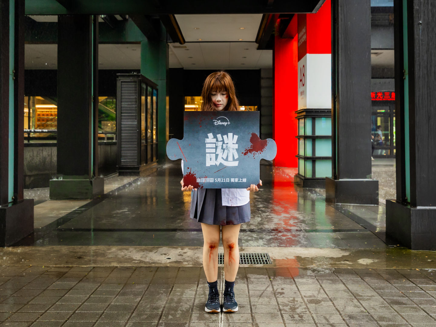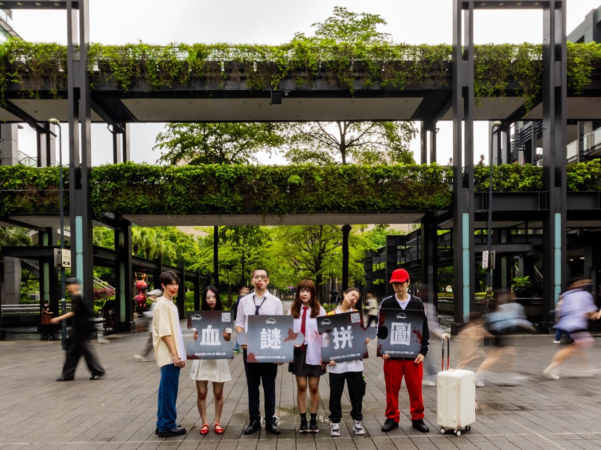 Disney+ 更在上週末於台北信義區舉辦《血謎拼圖》快閃活動為作品造勢,數名神秘人扮裝成兇殺案受害者倒在信義街頭,且身旁皆有一片沾滿血跡的拼圖,造型靈感則來自劇中練續殺人案的各種死狀,有遭勒斃的白衣女子、脖子上插著一把刀的男人、西裝筆挺卻莫名死亡的商人等,讓觀眾可以一睹《血謎拼圖》中的一樁樁神秘案件,也邀請觀眾們跟著金多美帶著這些謎樣拼圖一片片拼湊出案件的真相!