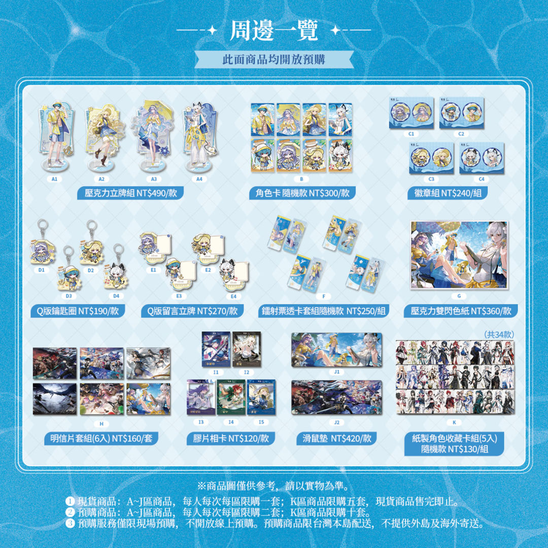 《鳴潮》本次將於一週年慶「夏日大作戰」活動現場設置周邊販售區,提供漂泊者選購周邊商品。漂泊者可透過「現貨購買」和「現場預購」形式,購買各類《鳴潮》周邊。以下為周邊一覽與詳細購買規則,請漂泊者們可先瞭解,屆時便能安心地盡情選購囉!