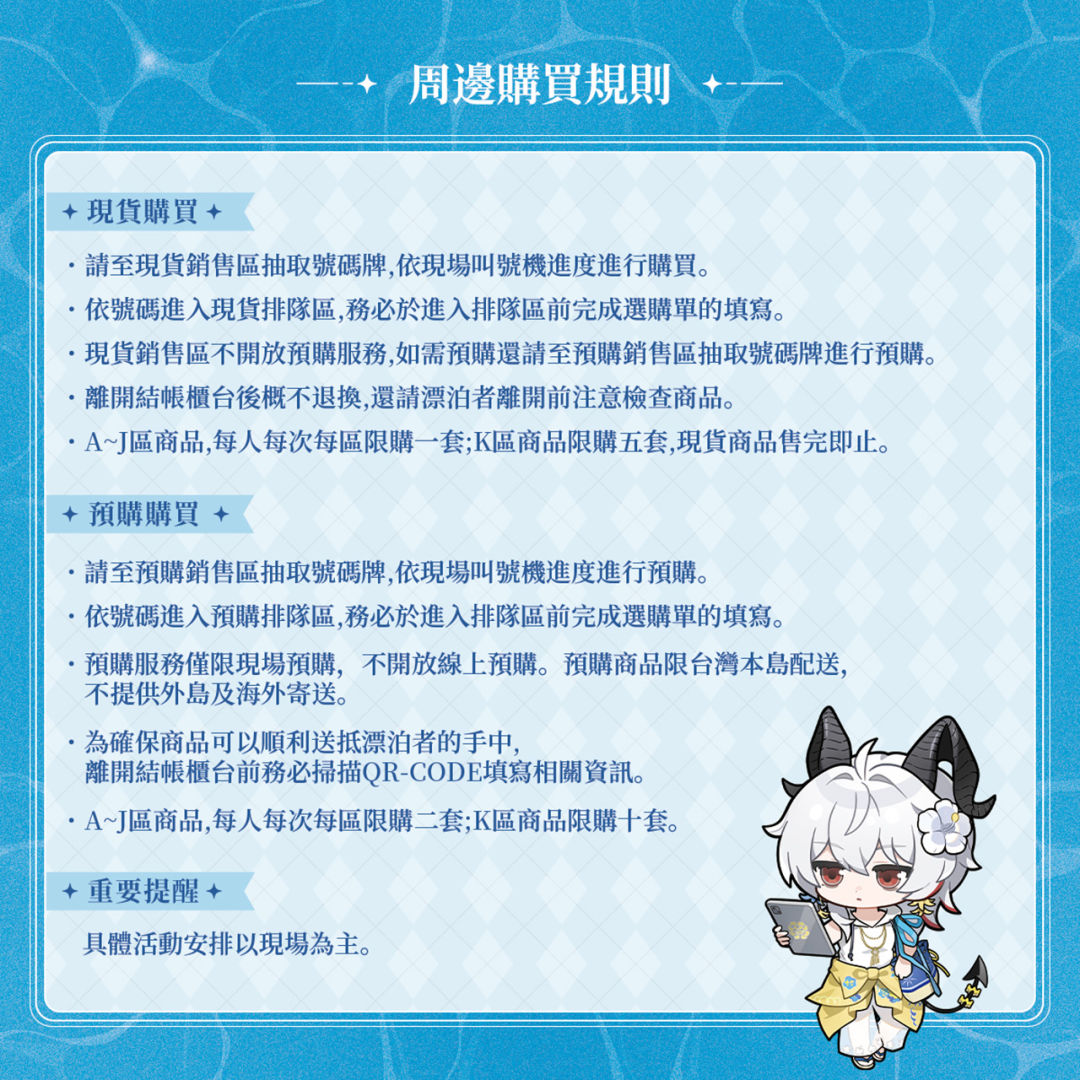 .A~J 區商品,每人每次每區限購一套;K 區商品限購五套,現貨商品售完即止。