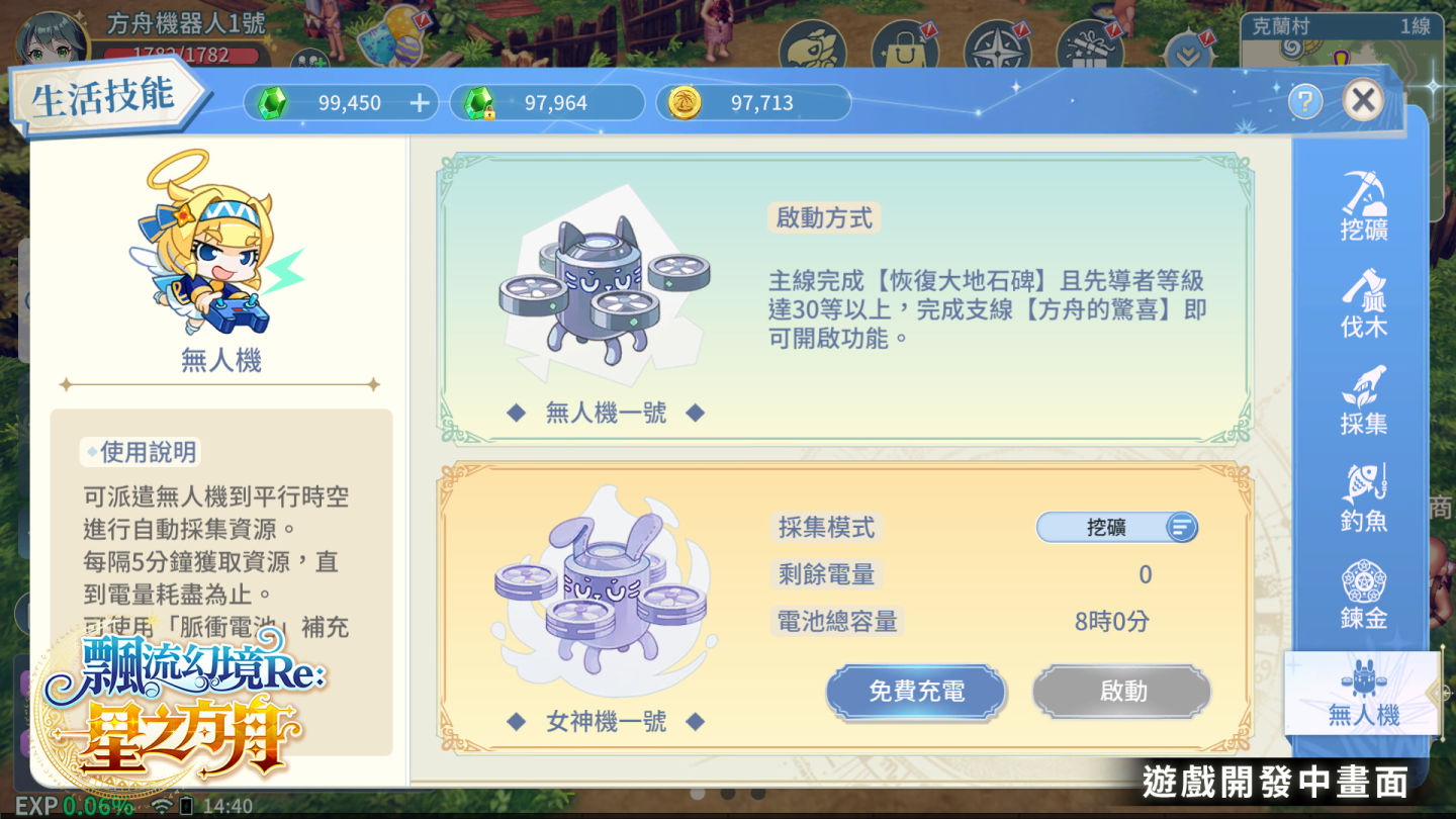 無人機支援三種採集模式「挖礦」、「伐木」、「採集」,可依照玩家當下所需選擇採集模式。每 5 分鐘即可產出一次採集結果,無需停留於採集地點等待,大幅節省時間與操作負擔,特別適合利用零碎時間進行遊戲的玩家使用。作為高效率的資源獲取管道,無人機系統將協助玩家可以更專注於劇情推進與角色養成,實現冒險與生活的最佳節奏平衡!