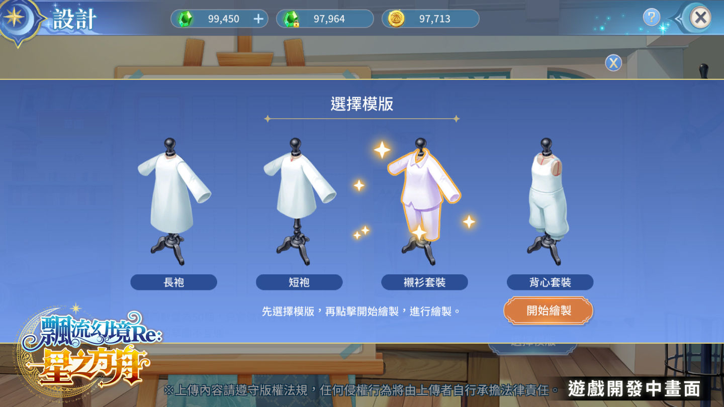 在草圖階段,玩家可於草圖介面中自由繪製心目中的圖樣款式,恣意施展創意,設計草圖將儲存在裝置中,最多可保存 50 份。當設計完成時,只需使用道具「魔法剪刀」便能將草圖轉化為樣板,正式紀錄到玩家帳號中;接著使用道具「七彩絲線」就能將自己設計的樣板製作為角色實際可穿戴的服裝。