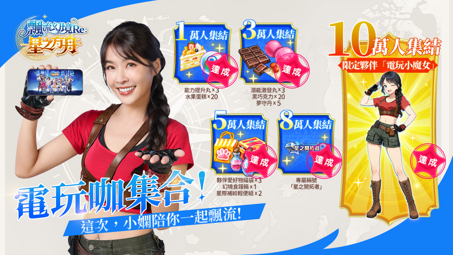 《飄流幻境 Re:星之方舟》自事前預約開啟以來,獲得許多玩家熱情支持,成功解鎖各階段達成獎勵!為慶祝預約人數突破 10 萬門檻,只要在 6 月 3 日遊戲上市後下載並登入遊戲,即可獲得全新限定夥伴「電玩小魔女」,未來將以探險家的身分,陪伴大家一起在嶄新的飄流世界中展開冒險。