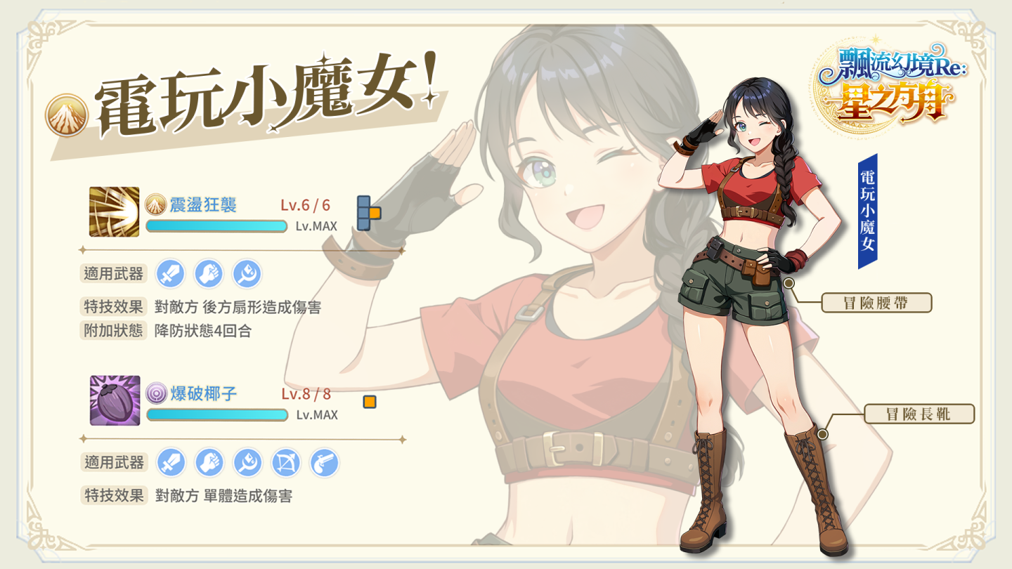 限定夥伴「電玩小魔女」為具有高防禦力的地屬性,擁有能夠降低敵人防禦的範圍攻擊特技,無論是在生存或是輸出方面都有十分亮眼的能力,相信將成為玩家們初期冒險中最可靠的夥伴之一!