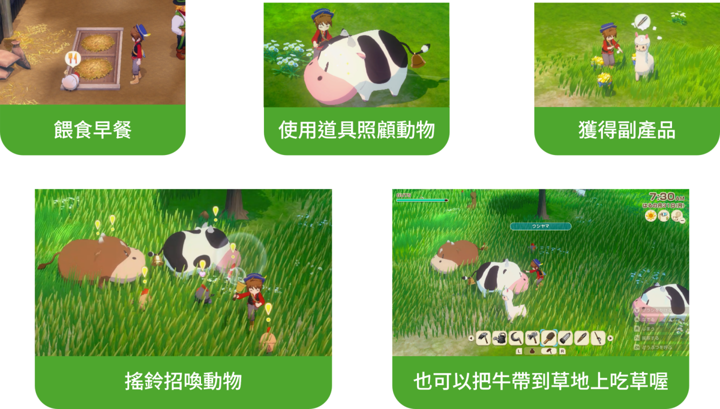 除了耕作之外,牧場主人的另一項重要任務,就是細心照料動物這些重要的夥伴。每天需要準備牠們的食物,並帶到戶外曬曬太陽,透過梳毛、擁抱等互動來維持牠們的健康,並加深彼此的感情。