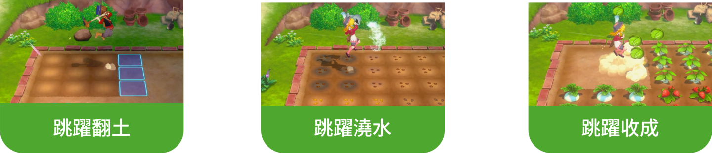 活用跳躍動作! 在跳躍時使用工具,雖然會消耗較多的「GUTS」,但能擴大工具的使用範圍,讓農作效率大幅提升。隨著遊戲進展,若取得更高級的農具,或習得秘傳技巧,說不定還能讓工具的效果範圍還能進一步擴大,讓耕作過程變得更加輕鬆有趣喔。