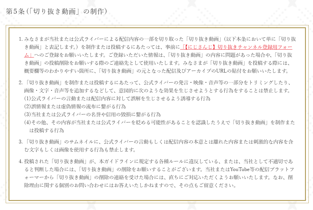 此外在剪輯影片的縮圖中,禁止使用與官方 VTuber 言行或直播內容本意相違,或帶有煽動性質的文字與圖片,所上傳的剪輯影片若違反本指引中所列的規定,或被本公司判定為不當內容,將可能被要求刪除,當上傳者接獲本公司或 YouTube 等平台方的刪除通知,請立即配合執行,至於刪除理由恕不提供個別回應。