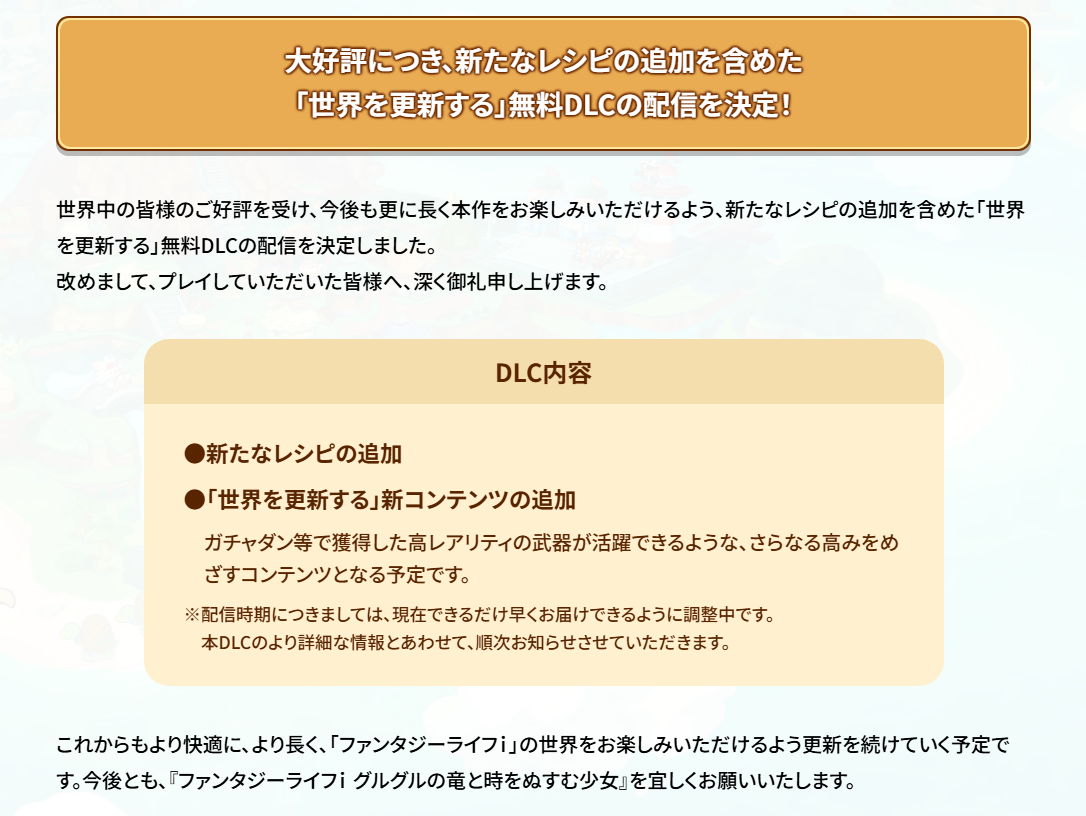 根據 Level-5 公告表示,為感謝玩家對遊戲的熱烈支持,決定推出免費 DLC,雖然目前未公開具體上線時間,但已透露該 DLC 會加入新配方與「更新世界」的新內容。具體來說,將會新增能活用如轉蛋樹等取得的高稀有度武器的內容,作為進一步可深入鑽研的遊戲要素,至於何時推出就有待官方日後發表。