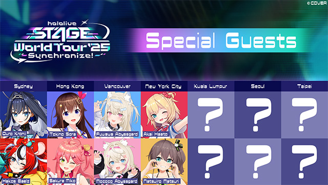 2025 年度的世界演唱會以雪梨為起點,之後陸續在香港/溫哥華/紐約/吉隆坡/首爾/台北等地開唱,參與成員包括 hololive 的桃鈴音音/hololive Indonesia 的 Kureiji Ollie/hololive English 的 Mori Calliope、IRyS、Nerissa Ravencroft 等五人,目前也已經公布前四場的特別來賓,分別是: