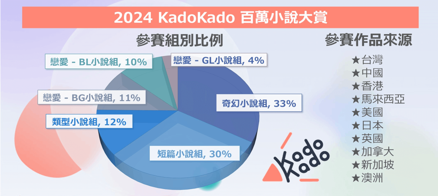自 2022 年首屆舉辦以來,「KadoKado 百萬小說創作大賞」已吸引上萬件作品投稿,涵蓋台灣、中國、香港、馬來西亞、美國、日本、英國、加拿大等地的華文創作者。2024 年參賽作品中,奇幻小說佔 33%,短篇小說佔 30%,類型小說佔 12%;戀愛小說 BL 題材佔 11%,BG 題材佔 10%,GL 題材佔 4%。多部得獎作品已發展為漫畫、影視、廣播劇等多元形式,展現出華文創作的蓬勃發展。