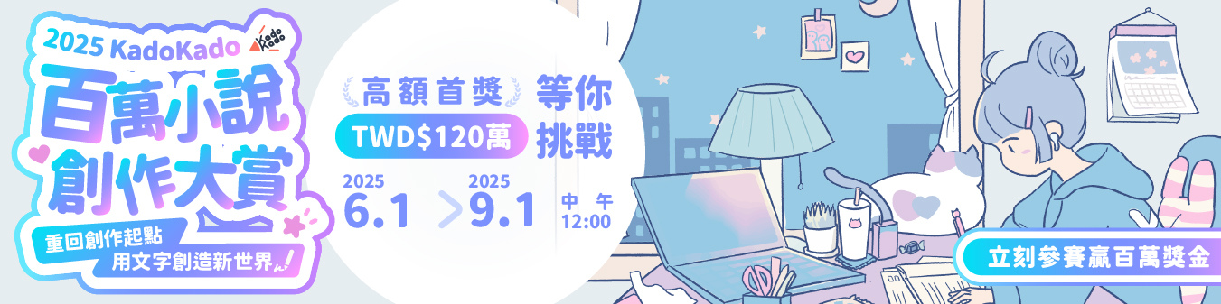 台灣角川旗下原創小說平台「KadoKado 角角者」正式啟動年度盛事「2025 KadoKado百萬小說創作大賞」,徵件期間自 2025 年 6 月 1 日(星期日)起至 9 月 1 日(星期一)中午 12:00(GMT+8)止。