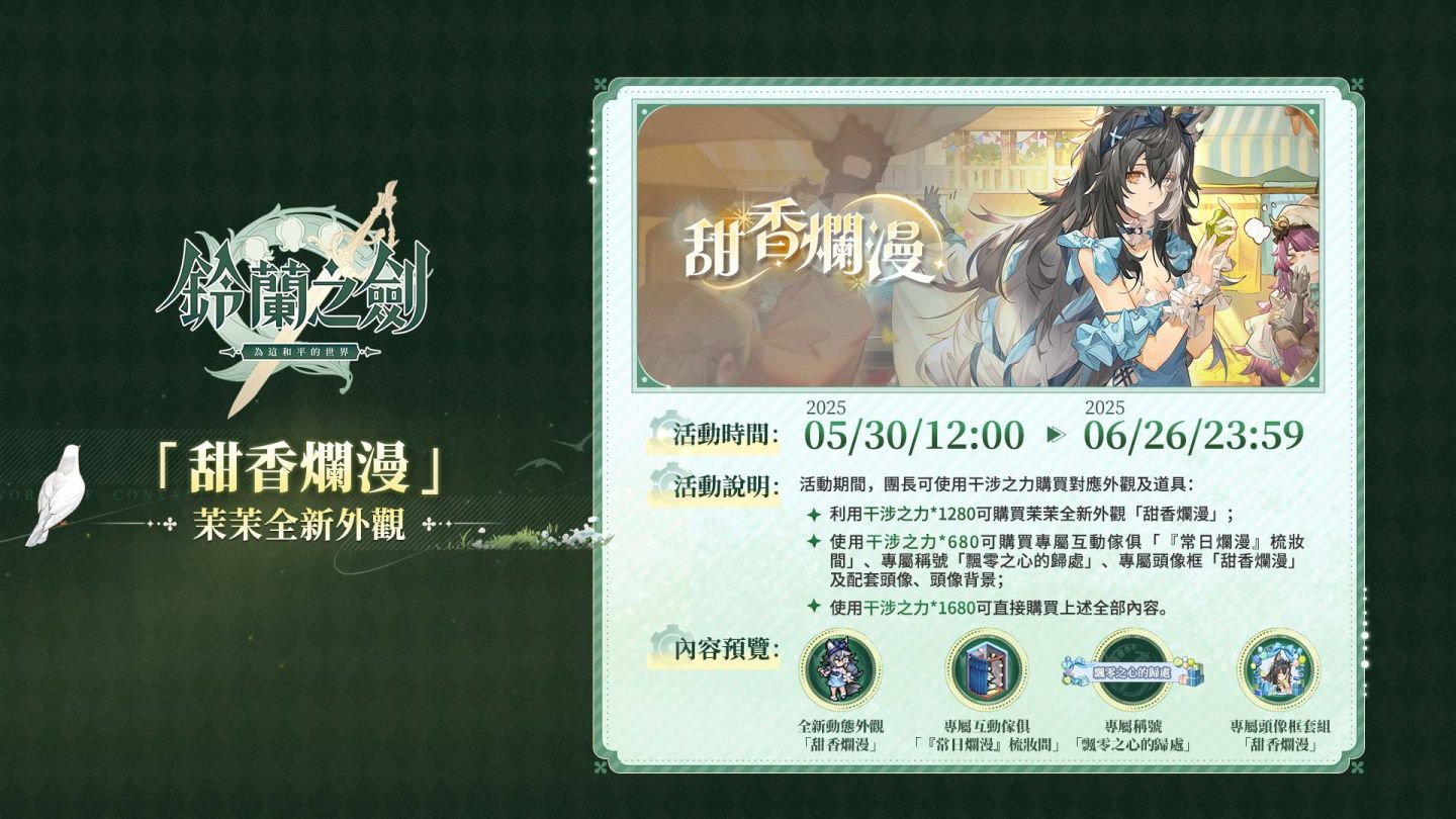 活動期間,使用干涉之力可兌換包含全新動態外觀「甜香爛漫」在內的豐富獎勵:專屬互動傢俱「『常日爛漫』梳妝間」、專屬稱號「飄零之心的歸處」、以及專屬頭像框套組「甜香爛漫」,快來為茉茉換上最可愛的節慶新裝吧!